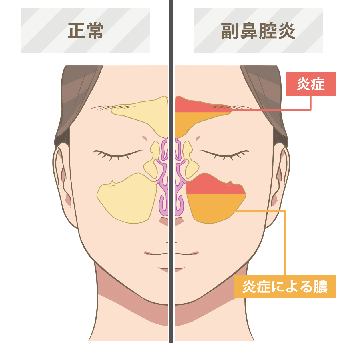 副鼻腔は鼻の周りに位置し、頭痛や頭重、おでこ・上顎・頬などの顔面痛を起こします。